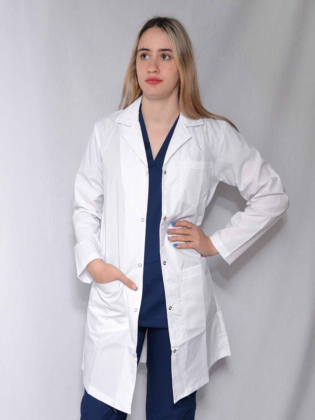 Guardapolvo entallado para mujer, confeccionado con tela Arciel, cuenta con 2 bolsillos inferiores y 1 superior.